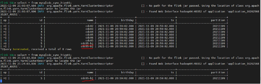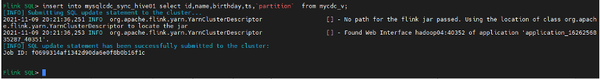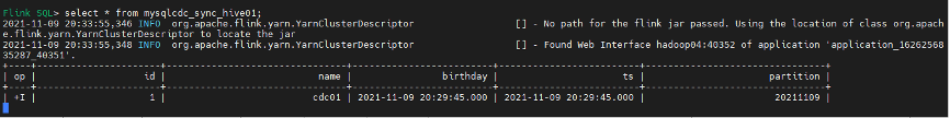 Flink SQL> select * from mysqlcdc_sync_hive01; --已查询到一条insert数据