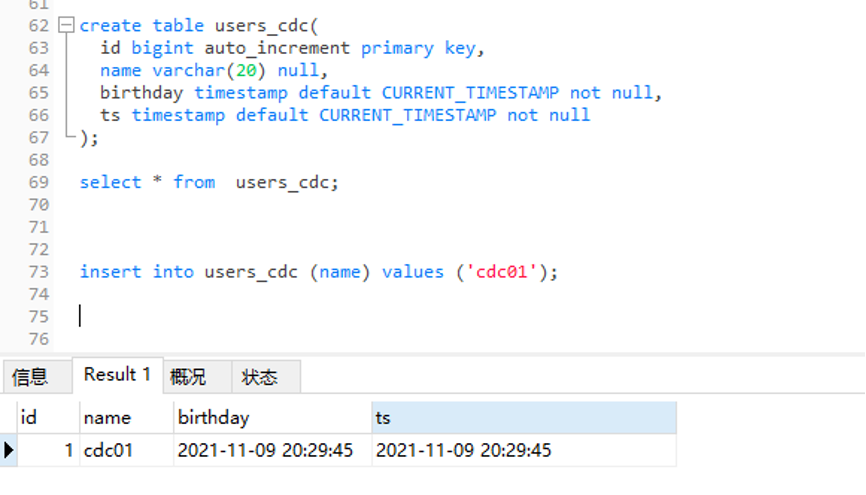 create table users_cdc(id bigint auto_increment primary key,name varchar(20) null,birthday timestamp default CURRENT_TIMESTAMP notnull,ts timestamp default CURRENT_TIMESTAMP notnull);