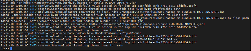 hive> add jar hdfs://nameservice /luo/hudi-hadoop-mr-bundle-0.10.0-SNAPSHOT.jar;