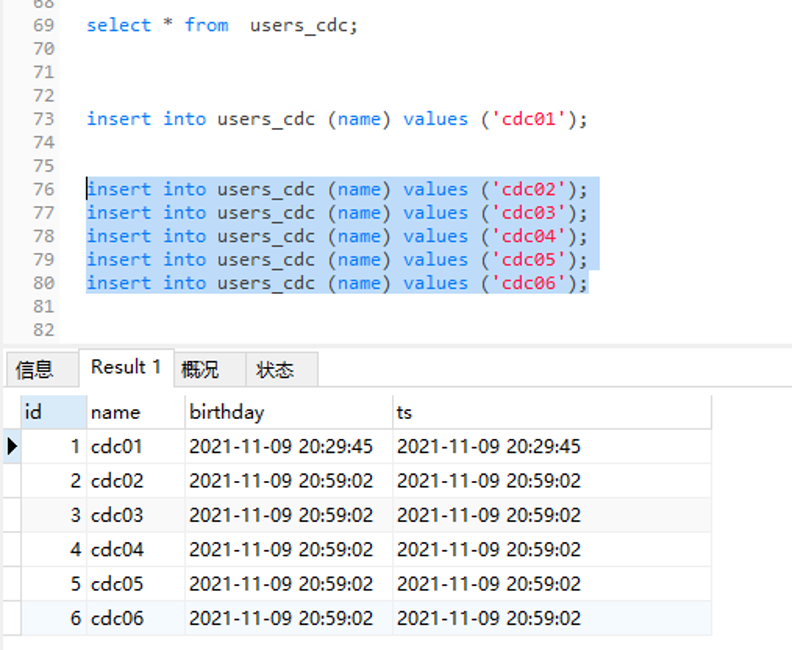 insert into users_cdc (name) values ('cdc02');insert into users_cdc (name) values ('cdc03');insert into users_cdc (name) values ('cdc04');insert into users_cdc (name) values ('cdc05');insert into users_cdc (name) values ('cdc06');