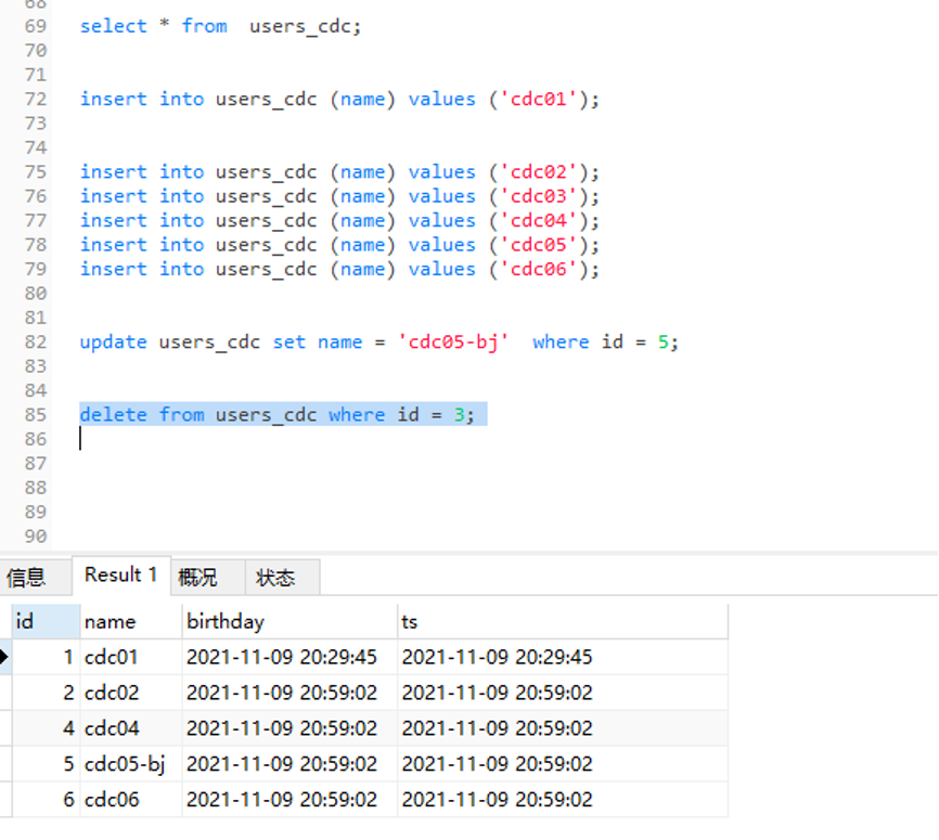 update users_cdc set name = 'cdc05-bj'where id = 5;