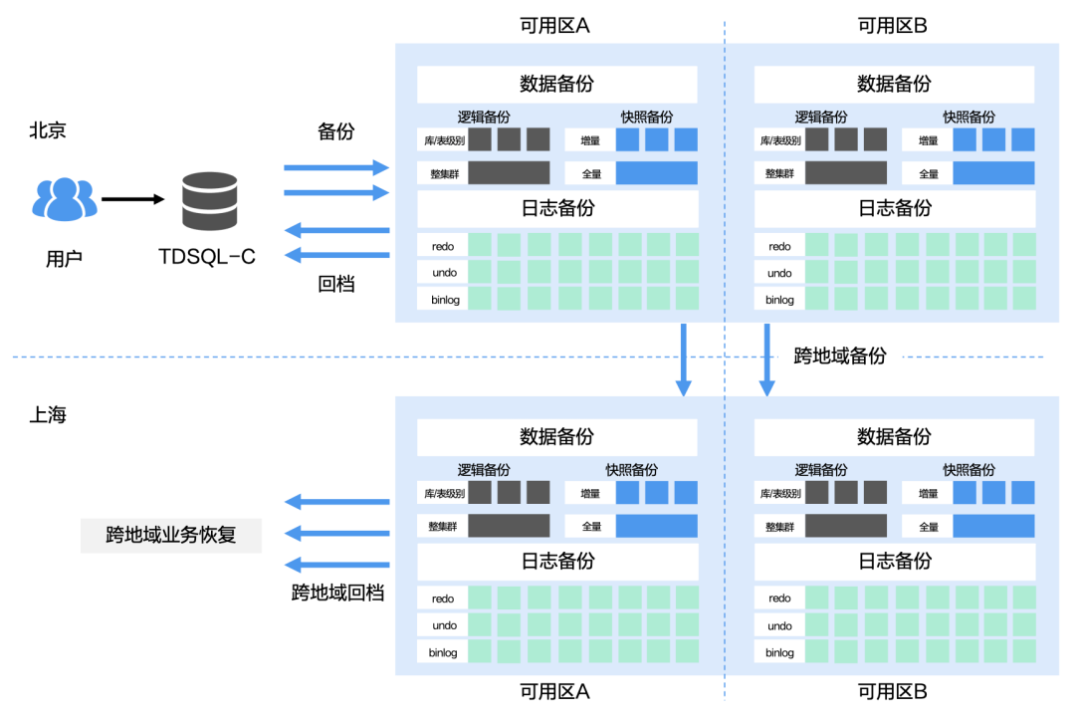 腾讯云云原生数据库TDSQL-C跨地域备份能力可以将数据库的备份文件,放到跨地域备份系统进行存储,无论用户之前采用的备份方式是自动还是手动,对应的备份文件均支持跨地域保存,并支持设置跨地域备份的保留策略。使用回档能力,即可在自然灾害、系统故障、员工误操作等造成本地域数据库损毁的场景下通过跨地域备份文件快速在异地恢复业务。