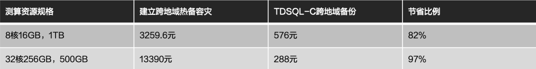 从对比结果可以看出,新建一个TDSQL-C集群,然后通过跨地域热备系统从主数据库做数据同步的费用是非常高的,而使用TDSQL-C的跨地域备份,相对于新建跨地域热备容灾的方式能节省最高97%的成本。