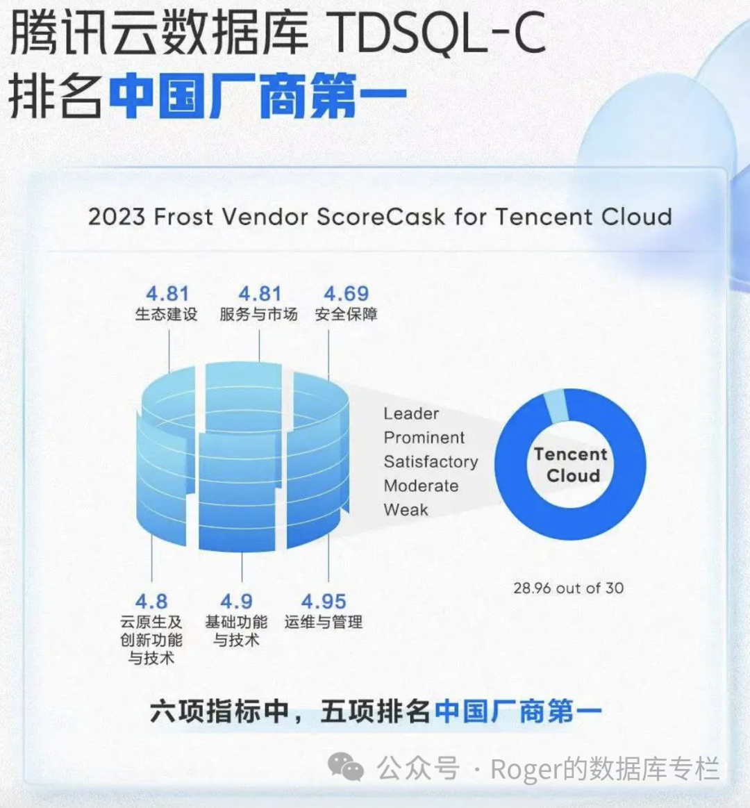 既然未来数据库大部分都是基于云的形态,那么云原生数据库,无疑就是当前最为重要的之一了。因此前几天国际权威调研机构沙利文联合头豹研究院,正式发布《2023年中国云原生数据库十大厂商推荐-市场综合力表现》报告,腾讯云原生数据库TDSQL-C综合得分28.96分(总分30分),位居国内厂商第一位,入选中国云原生数据库解决方案市场“领导者”阵营。