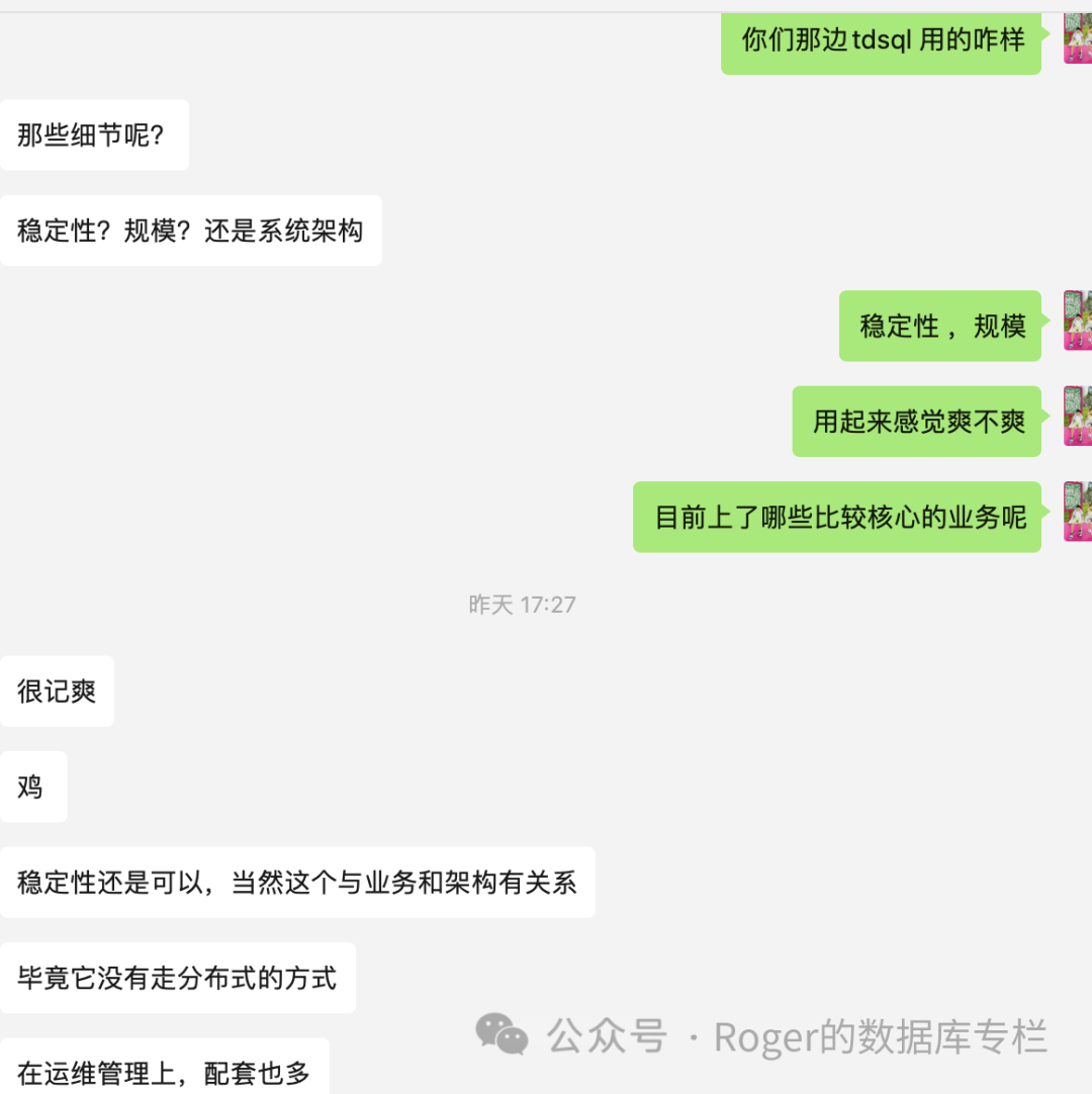至于生态等其他方面暂时不提,虽然自己是拥有10多年运维经验的数据库老司机,实际上个人对TDSQL的运维体验很缺乏,那么多其运维管理到底如何呢,用户用起来到底爽不爽呢?我想最有发言权的一定还是实实在在的用户,刚好我们之前团队一位兄弟去了某银行,该银行目前使用了TDSQL承载核心业务,我随便问了几句使用体验,总的来看感觉是非常不错的,使用起来比较丝滑,知识库也不错。