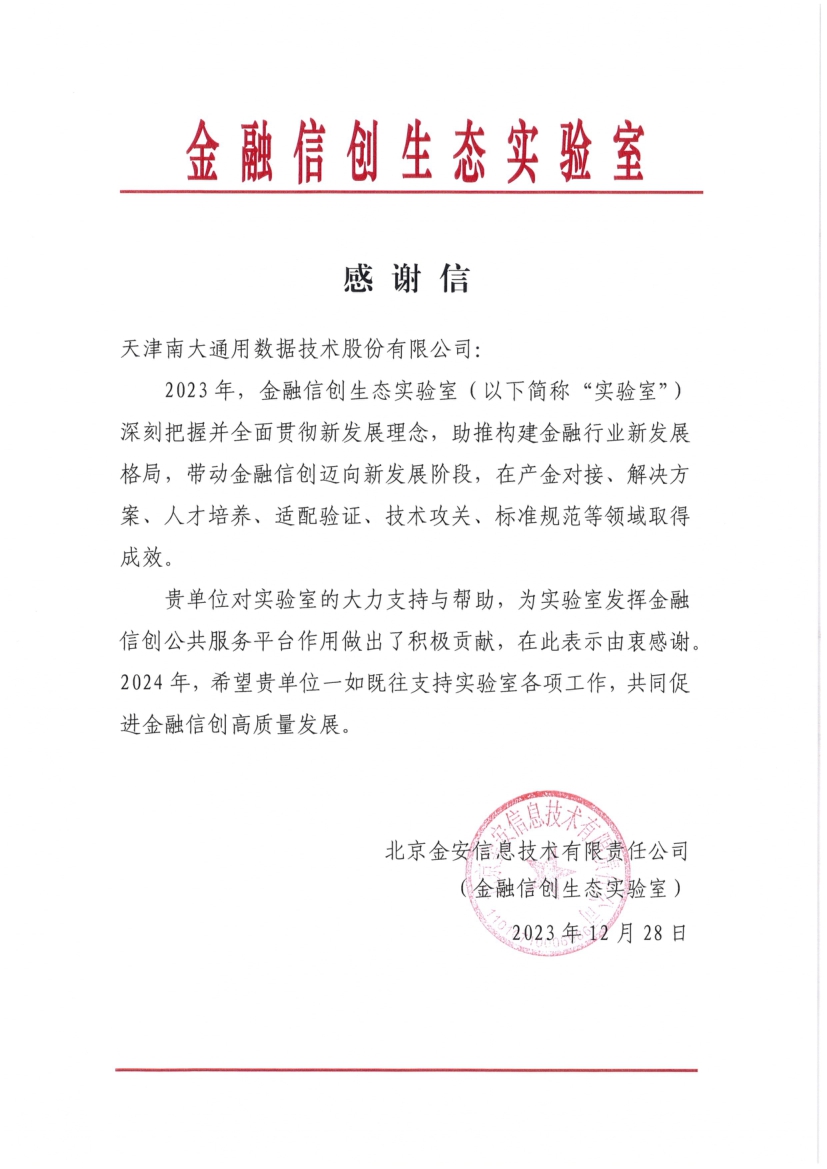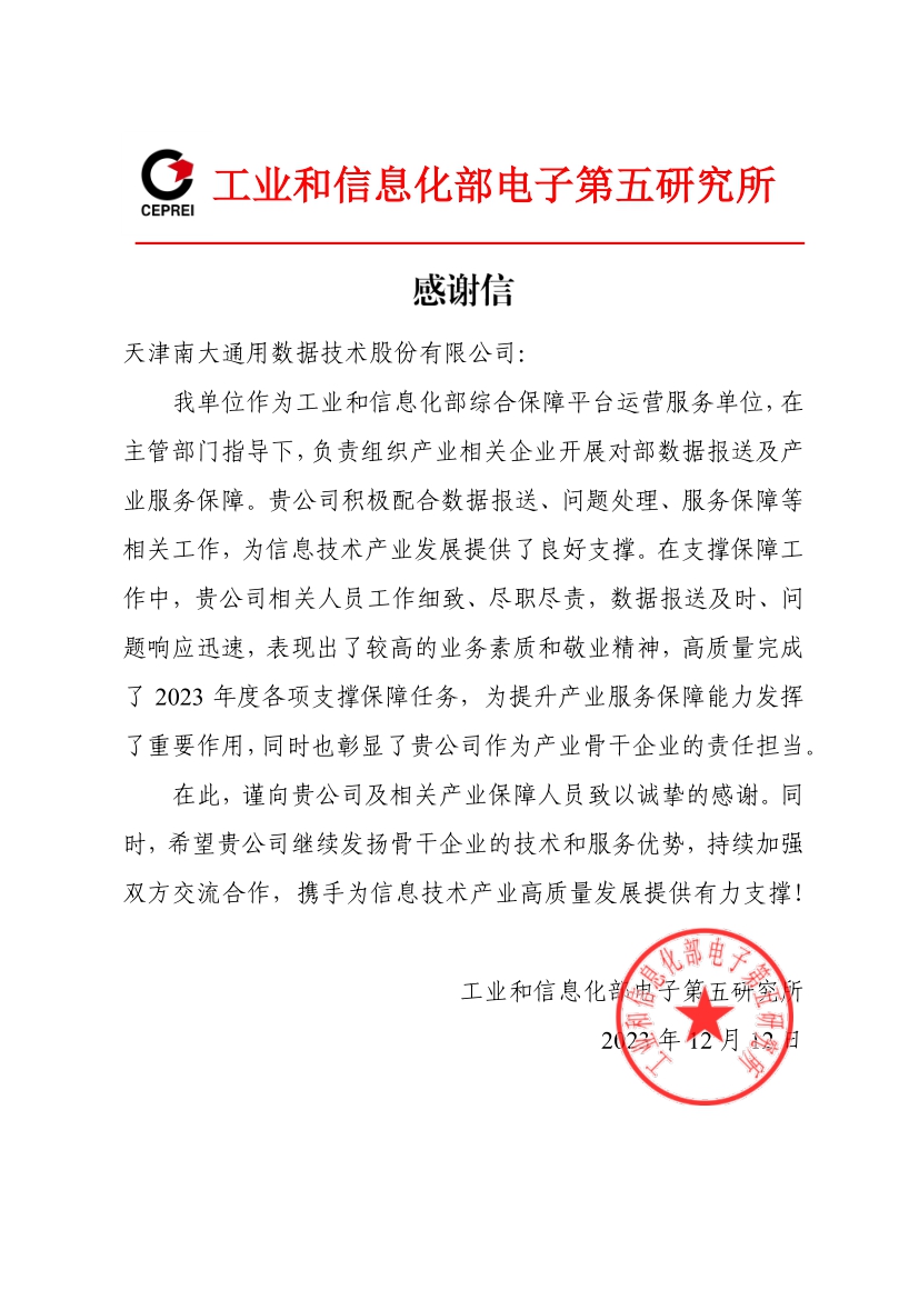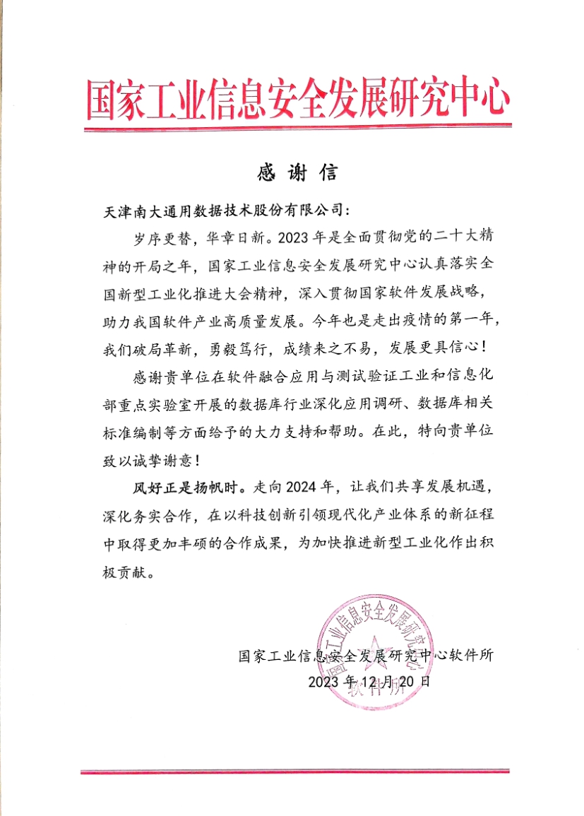 新元肇启,一封封表扬信、感谢信纷至沓来,为GBASE南大通用持续创新的新一年增添了许多喜意。第一批感谢信中,有来自工业和信息化部电子第五研究所、国家工业信息安全发展研究中心、金融信创生态实验室等主管单位对公司积极履行企业责任,配合服务保障工作,参与数据库标准编制、行业应用调研进行充分肯定,并对公司发挥技术优势,推动国产数据库自主创新给予了高度评价。