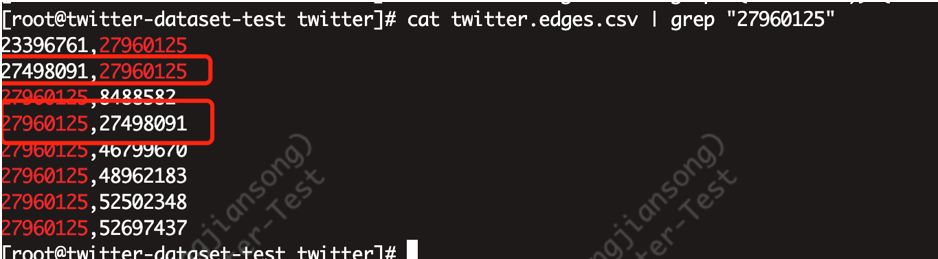 我们先从验证1度(1跳)邻居开始,以Twitter数据集的顶点“27960125”为例,在源数据集中,如下图所示,返回了8行(对应图数据库中的8条边!),但是它的1度邻居到底是几个呢?