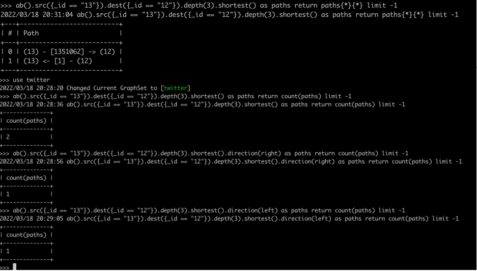 为了更精准地验证结果正确性,对K邻查询还可以按照边的方向来进行过滤,例如只查询顶点“2796015”的出边、入边或者双向边(注:默认是查询双向边关联的全部邻居)。下图展示了如何通过图查询语言来完成相应的工作。注意,该顶点有6条出边对应的1跳邻居、2条入边对应的1跳邻居,其中有1个邻居“27498091”是重叠的。