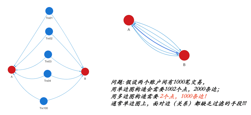 其中,构图错误代表着数据建模错误,这意味着业务逻辑不能在数据建模层面被准确反应。例如在反欺诈、反洗钱场景中,账户A收到了一笔来自账户B的转账,但是却因为没有存储一条从A至B的反向边而无法追踪该笔交易,这显然是不能容忍的。查询方式和查询代码逻辑错误同样也会对结果造成严重影响——每一跳查询双向边,在多跳情况下查询复杂度指数级高于单向边查询,这也意味着Tigergraph如果正确地实现图数据建模、存储与查询,其性能会指数级降低,并且存储空间的占用也会成倍增加(存储正向+反向边的数据结构要比仅存储单向边复杂2x以上),数据加载时间也会成倍增长。