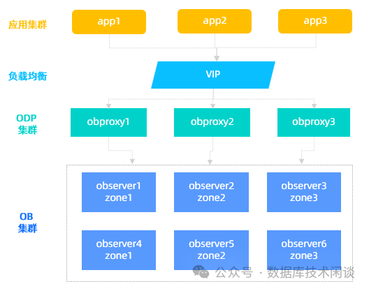 多个 OBProxy 虽然称为 ODP 集群,实际上并无集群的基本能力(高可用和负载均衡)。每个 OBProxy 独立工作,都可以访问到 OceanBase 集群。ODP 集群的高可用和负载均衡要借助于负载均衡设备(LB 设备,如 F5、A10 或 SLB、LVS)。很多分布式数据库都有这个设计。