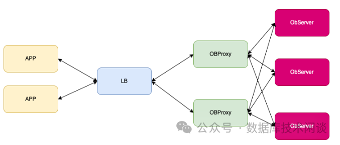 应用连接 OBProxy 或者应用连接 LB 提供的 VIP 间接连接到 OBProxy,OBProxy 再根据应用连接账户创建到后端 OBServer 节点的连接并转发应用 SQL 到该节点执行。