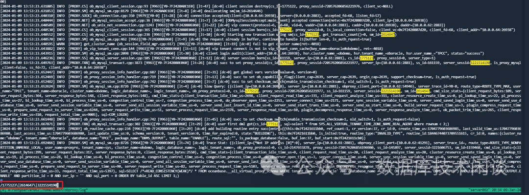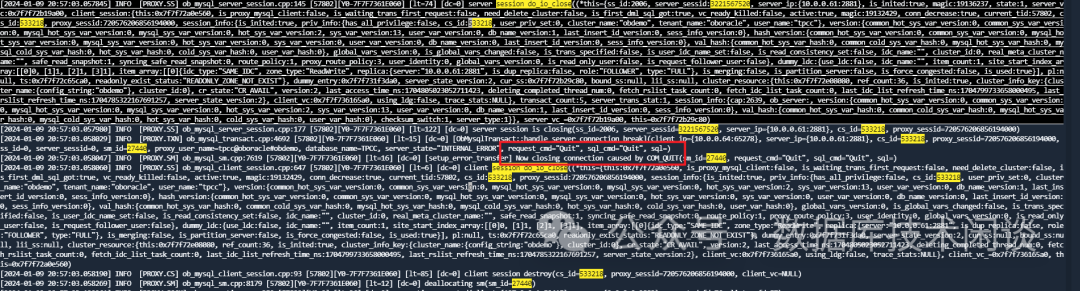 [2024-01-09 13:30:41.366475] INFO [PROXY.SM] ob_mysql_sm.cpp:2098 [9946][Y0-7F2420A0E260] [lt=10] [dc=0] client login audit(client_addr={10.0.0.64:21780}, hsr.cluster_name_=obdemo, hsr.tenant_name_=oboracle, hsr.user_name_="TPCC", status="success")[2024-01-09 13:30:41.366725] INFO [PROXY.SS] ob_mysql_server_session.cpp:105 [9946][Y0-7F2420A0E260] [lt=7] [dc=0] server session born(ss_id=160972, server_ip={10.0.0.61:2881}, cs_id=205721, proxy_sessid=0, server_type=1)[2024-01-09 13:30:41.366917] INFO [PROXY.TXN] ob_mysql_transact.cpp:3873 [9946][Y0-7F2420A0E260] [lt=10] [dc=0] succ to set proxy_sessid(cs_id=205721, proxy_sessid=720576206856221790, server_ip={10.0.0.61:2881}, ss_id=160972, server_sessid=3221509959, is_proxy_mysql_client=false, ss_fd=104, client_addr="10.0.0.64:21780")
