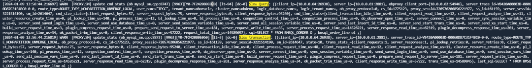 需要注意的是 OBProxy 里 Slow Query 和 Slow transaction 并不一定是 SQL 或事务结束了才打印,而是会定时打印,即使 SQL 还在执行过程中,所以这个日志里的执行时间也只是代表日志打印的时候这个 SQL 和事务的持续时间(可能还没有结束)。当然如果跟踪最后一次日志打印,那也能推断出耗时的大概时间了。实际也不用这么麻烦,obproxy_slow.log 离最终也会记录慢 Query 的耗时。