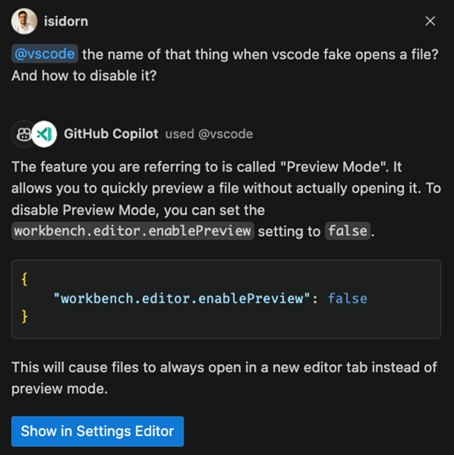 注意,响应中有一个“在设置编辑器中显示”按钮。这是因为 @vscode 代理不仅了解 VS Code 的工作原理,还具有调用设置编辑器或命令面板的工具。
