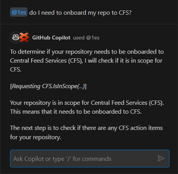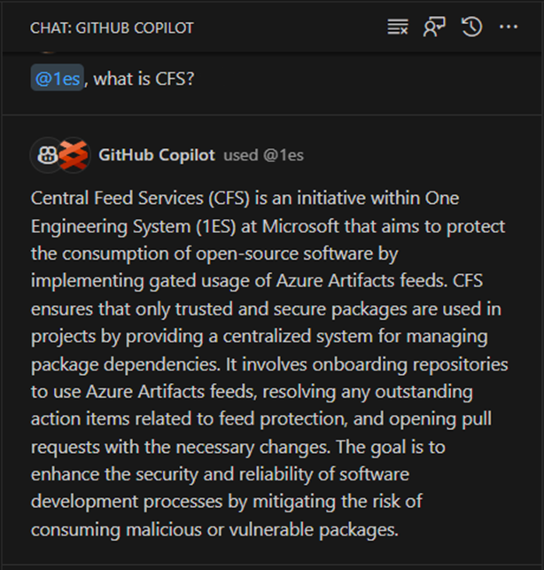 代理在访问该域的工具时,可以带入任何特定域的内容。例如,1ES 代表 One Engineering System,是微软的内部工程系统。1ES VS Code 扩展插件提供了一个 @1es 代理,可以回答微软内部工程师的特定问题。@1es 代理可动态规划并显示其实际工作。它使用 LLM 模型中的一些公共数据,但也能识别微软内部的具体情况,并将两者结合起来提供最佳答案。