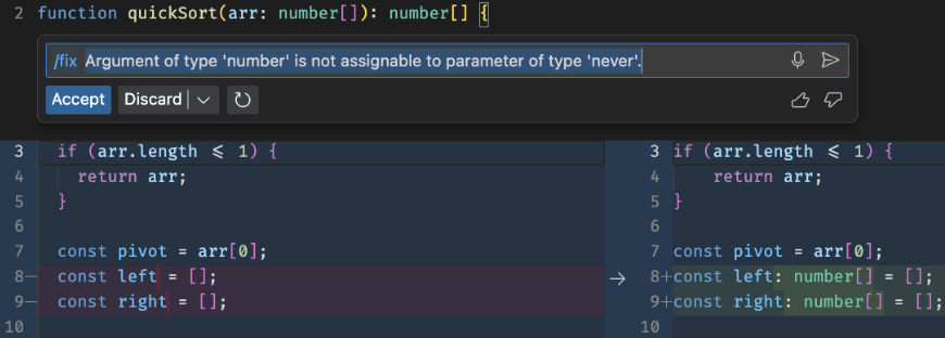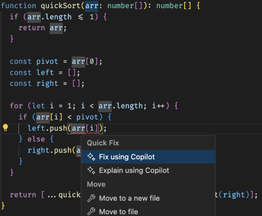智能操作可无缝集成到 VS 代码流程中(例如,在快速修复和上下文菜单中),而且完全不需要编写任何提示。功能最强大的智能操作是 /fix。这里有一个相对简单的 TypeScript 快速排序算法,出现了一个错误,指出“类型'number'的参数不能赋值给类型'never'”。点击灯泡按钮,选择使用 Copilot 修复。