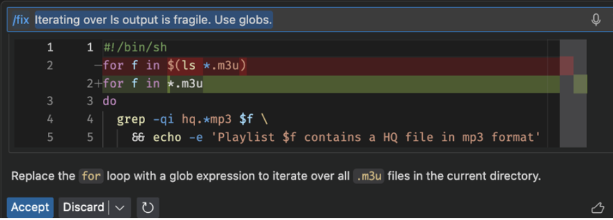 我们注意到,/fix 对 shell 等语言特别有用,因为这些语言有时缺乏传统工具。