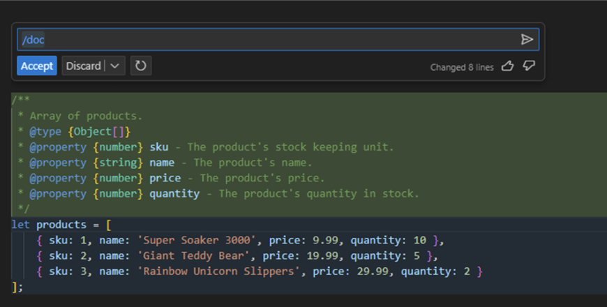 与 /fix 类似,/doc 智能操作也很受用户欢迎。要使用 /doc ,选择一块代码,右键单击,选择 Copilot > 生成文档。Copilot 会为您的代码生成文档注释,我们相信您会对文档的质量感到惊讶。