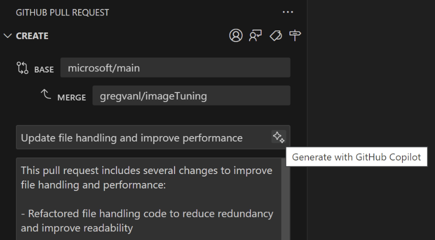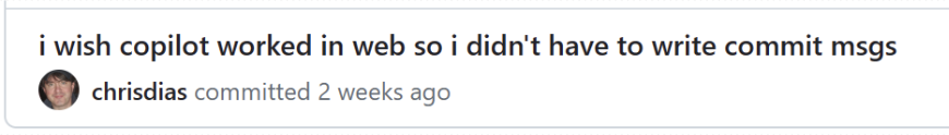 有时,意图非常明确。在这种情况下,使用人工智能的体验会让人感觉近乎神奇。我目前最喜欢的功能之一就是 Copilot 自动生成提交消息的能力。在安装了 Copilot 的源代码视图中,您会看到提交消息字段旁边有一个新的闪亮图标。选择这个图标,Copilot 就会帮您填写消息!