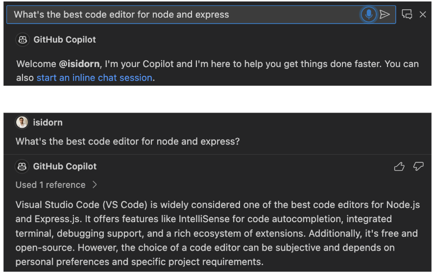 新的 VS Code 语音扩展为 VS Code 提供了语音到文本的支持。安装后,您将在所有自然语言输入对话框中看到麦克风图标。选择该图标,向 Copilot 提问,享受神奇的效果吧。