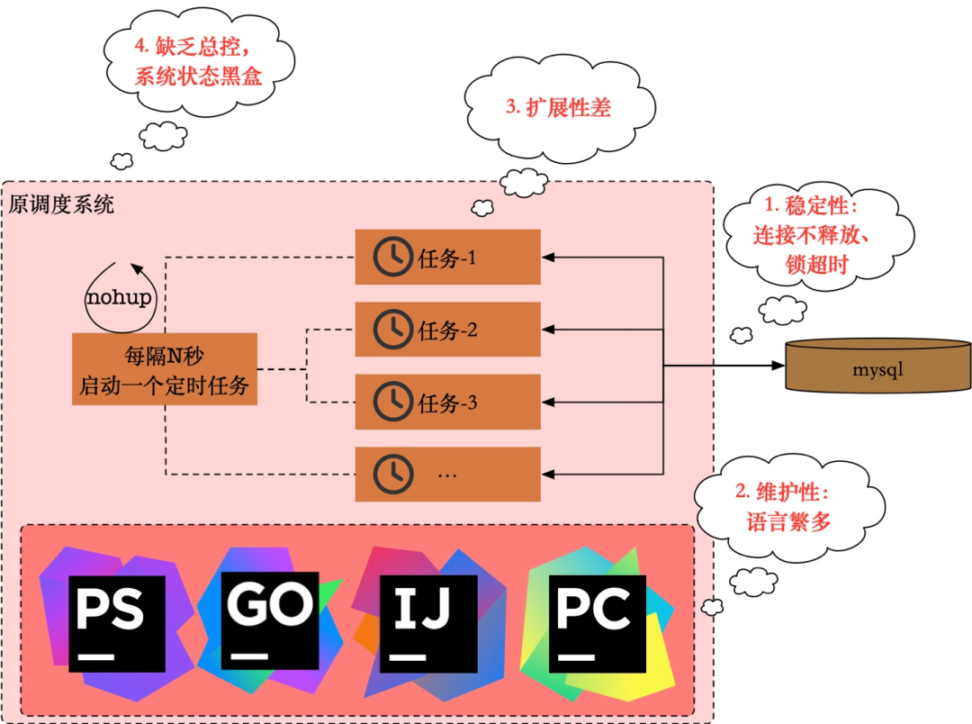 原有调度系统是 2015 年 (抑或更早) 自研的,随着任务类型新增、任务数量增多,暴露出诸多问题: