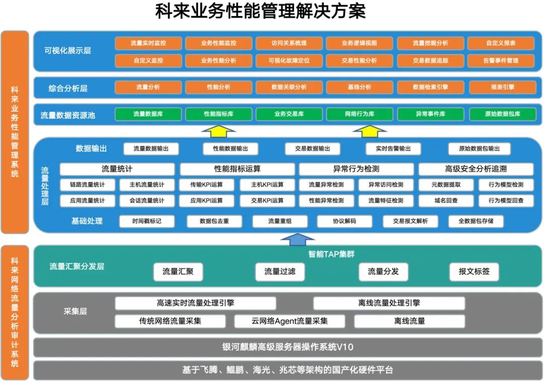 针对当前信息网络系统运维所面临的挑战,科来网络技术股份有限公司(以下简称“科来”)基于其在网络流量分析领域的技术实力,结合银河麒麟高级服务器操作系统在性能、兼容性和适配性等方面的优势,推出业务性能管理解决方案。方案定位于智能运维领域,围绕客户的业务网络提供全量采集、存储、分析及实时监控,实现快速故障定位。