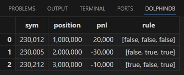 // 默认规则检查最大持仓,最大亏损以及收益率y = [ [ < position >= 3000000 >, < pnl < -10000 >, < pnl\position < 0.01 >], [< pnl < -10000 > ], [ < pnl\position < 0.01 > ] ]ruleSets = dict(x, y)//创建规则引擎test = createRuleEngine("posRule",ruleSets, dummy ,`sym`position`pnl, outputTable, "all")//仓位表posTable = table([230012,230005,230212] as sym, [1000000, 2000000, 3000000] as position, [20000, -30000, -10000] as pnl)// 根据默认的风控规则检查仓位表中的数据test.append!(posTable)