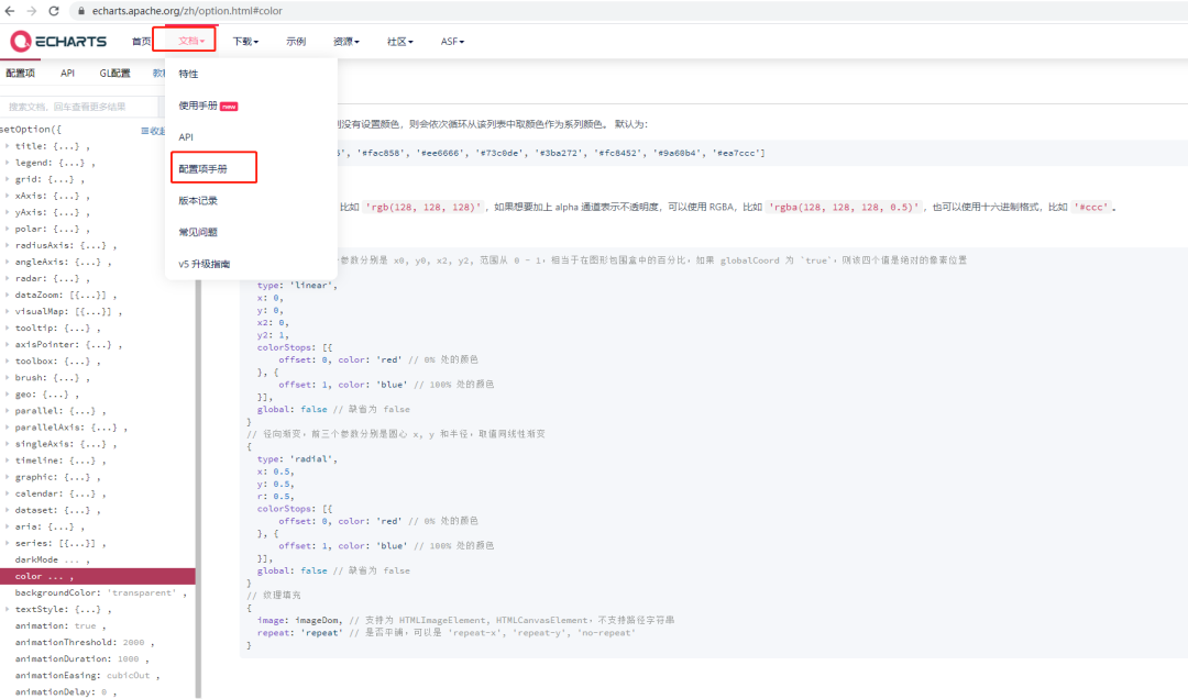 下面demo里面的图标颜色、样式都可以在 echarts官网-文档-配置项手册里面进行查看, 是支持通过修改里面的配置项里面的属性来达到项目需求,我们可以去进行查看修改。