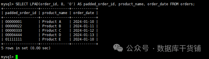 SELECT LPAD(order_id, 8, '0') AS padded_order_id, product_name, order_dateFROM orders;