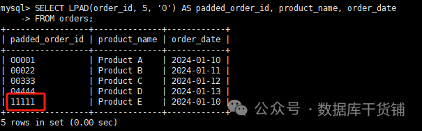 下面简单举例演示,假设我们有一个存储订单编号的表,我们希望订单编号始终为5位数,并在不足5位时用零进行填充。