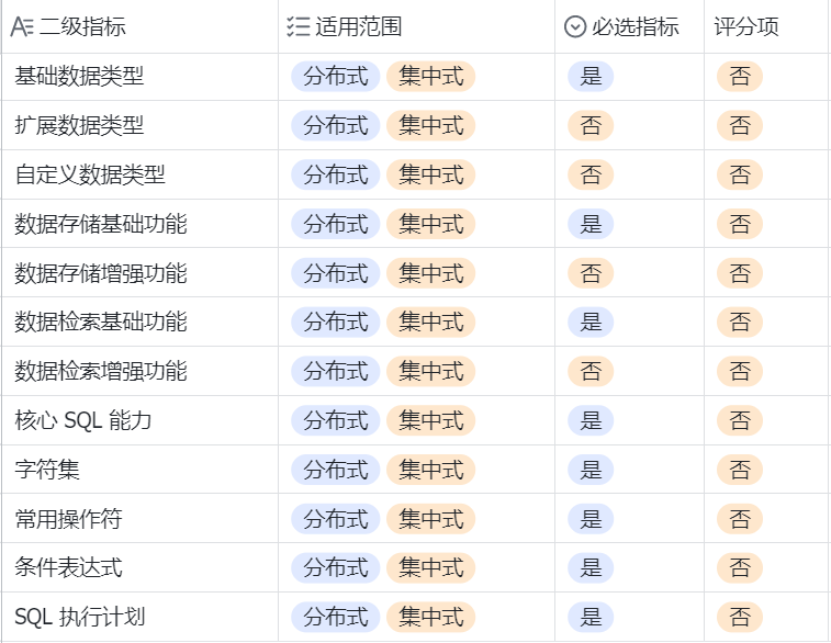 这部分包括数据类型、SQL 语句、字符集、操作符、执行计划等,就是数据库基础能力。这里面比较受关注的点一是针对扩展数据类型的定义、存储、检索的支持,随着用户场景的复杂,扩展数据类型成为一种必然;二是字符集支持,去年也有不少国内厂商通过了中国强制字符集标准GB 18030-2022;三是针对 SQL 执行计划干预能力,这样可以有效解决数据库优化器能力不足或Bug所导致的执行路径异常,可快速解决用户问题。