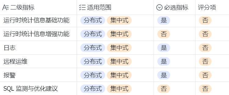运维方面包含的内容很多,标准把运维方面的重点放在信息的获取、告警方面。强调了从主机、系统、实例、语句多维度获取数据以便于运维保障,比提供远程运维能力以及针对语句的运维能力。从现状来看,分布式架构产品存在一定短板,主要是因为其组件多、受基础环境影响大等原因,对信息输出进而诊断的能力显得尤为重要。很多产品是将信息做了输出,但如何快速识别、快速定位、快速诊断并进而解决问题,还是困扰着很多用户。这方面确实可以向如 Oracle 这些老牌数据库产品学习。