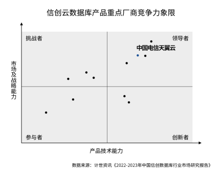 1月9日,计世资讯(CCW Research)发布《2022-2023年中国信创数据库行业市场研究报告》(以下简称“报告”),从产品技术能力和市场及战略能力两个维度对我国主要数据库产品服务商进行竞争力分析。其中,中国电信天翼云凭借其产品丰富的管理功能、灵活的部署架构,位列云数据库产品领域领导者象限。