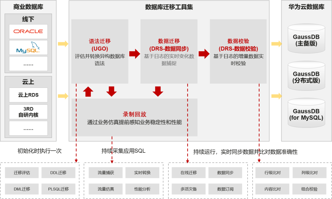 录制回放是DRS提供的业务仿真特性,结合DRS+UGO,以及DRS提供的数据一致性对比能力,形成了华为云数据库迁移整体解决方案,以保障客户割接过程的平滑性以及割接后数据库的稳定可靠运行。