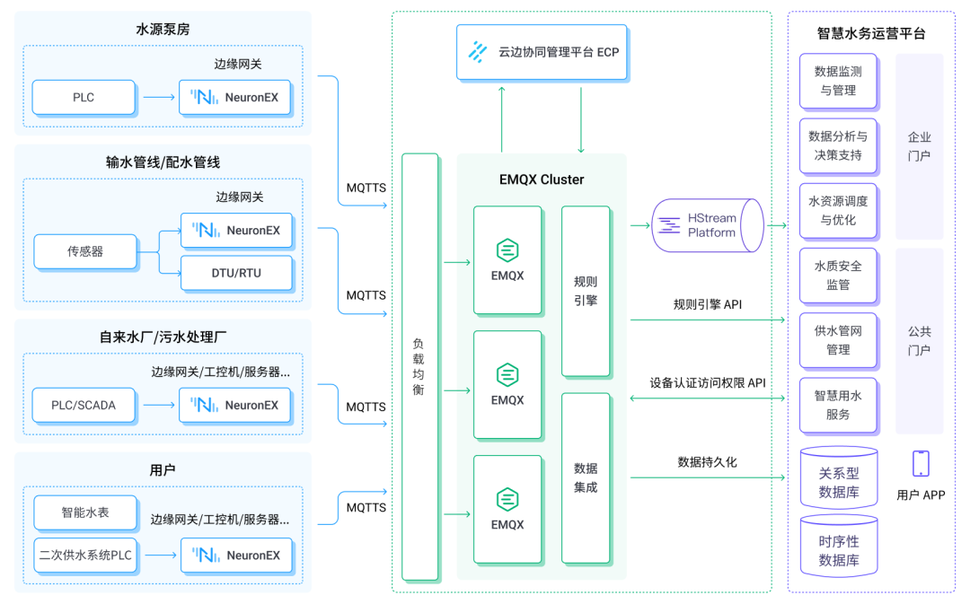 基于 EMQX 企业版高可用集群、加密认证、规则引擎、数据集成等集团级消息总线的能力,提供统一、安全、高效集成的水务物联网平台,帮助管理城市每秒产生的几十万甚至上百万的智能水务设备消息。平台涵盖整个城市水资源管理、供水管理、污水处理、水质监测、用户用水等实时信息的汇聚和整合,通过云计算、大数据、人工智能等先进技术的融合,高效实现数据监测与管理、数据分析与决策、水资源调度与优化、水质安全监控、供水管网管理、用水服务等智慧水务运营业务。
