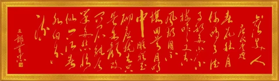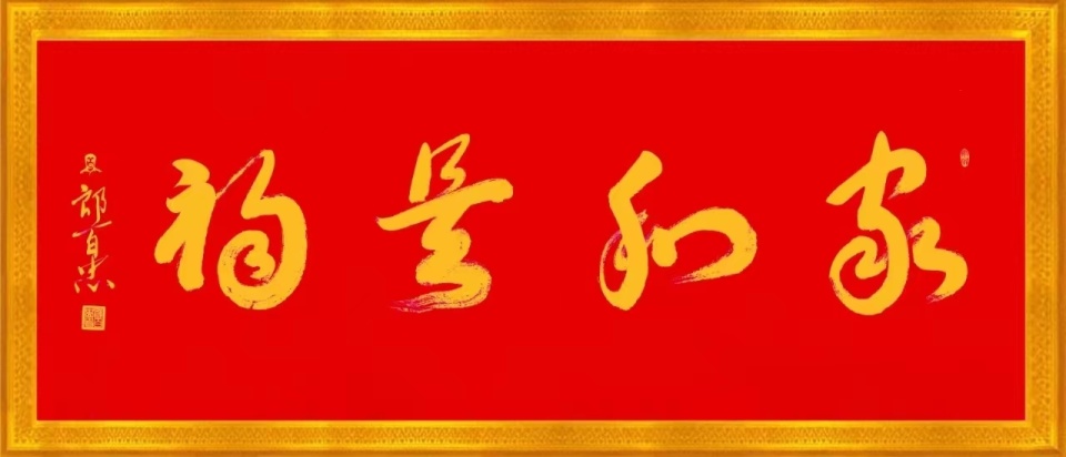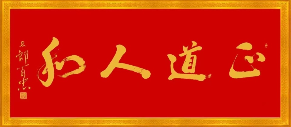 书法作品《正道人和》,可谓是郎百忠先生实现了作品思想性与艺术性的创造性融合与统一,成为洒脱不失严谨,奔放不失方圆的“国字体”代表作。该幅作品贯穿郎百忠艺术创作始终的是对党的事业坚定不移的理想信念以及对中华民族伟大复兴的一片赤子深情。而所有这一切都成为他十年如一日勤学苦练的不竭动力。郎百忠作品取材慧眼别具,走笔行云流水,整体布局开阖有度,寓意深刻;章法错落有序,引人入胜。