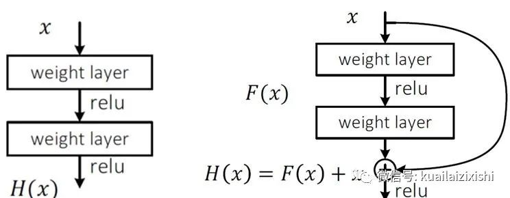 上图的左半部分是常规的神经网络形式,每层有权值和激活函数,这里的激活函数采用的是RELU函数,目的是为了避免梯度消失的问题,右半部分是残差网络的基本单元,和左边最大的不同在于多了一个身份即多了一个直接到达输出前的连线,这代表什么意思呢?刚开始输入的X,按照常规的神经网络进行权值叠加然后通过激活函数,在次权值叠加后此时在把输入的信号和此时的输出叠加然后在通过激活函数,就是这样的一个网络,而那条线称为捷径,也称为高速公路,加这个高速公路有什用呢?这个残差怎么理解呢?大家可以这样理解在线性拟合中的残差说的是数据点距离拟合直线的函数值的差,那么这里我们可以类比,这里的X就是我们的拟合的函数,而H(x)的就是具体的数据点,那么我通过训练使的拟合的值加上F(x)的就得到具体数据点的值,因此这 F(x)的就是残差了。