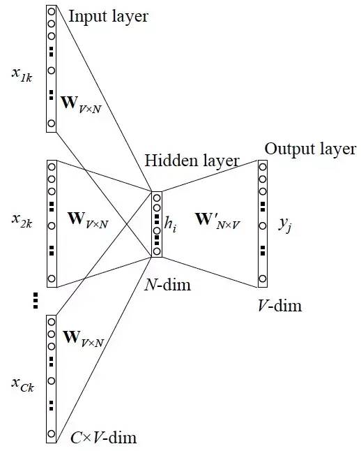 •1.输入层:上下文单词的one-hot. {假设单词向量空间dim为V,上下文单词个数为C}•2.所有one-hot分别乘以共享的输入权重矩阵W. {VN矩阵,N为自己设定的数,初始化权重矩阵W}•3.所得的向量 {因为是one-hot所以为向量} 相加求平均作为隐层向量, size为1N.•4.乘以输出权重矩阵W' {NV}•5.得到向量 {1V} 激活函数处理得到V-dim概率分布 {PS: 因为是one-hot嘛,其中的每一维斗代表着一个单词}•6.概率最大的index所指示的单词为预测出的中间词(target word)与true label的one-hot做比较,误差越小越好(根据误差更新权重矩阵)