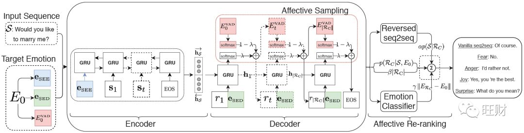 从模型中看出,输入是用户的对白和情绪的三种封装向量,模型主体是一个encoder-decoder结构,编解码器之后输出之前进行的这步re-rank是关键,能够对召回的多种对白按照情绪进行一个编码后输出。