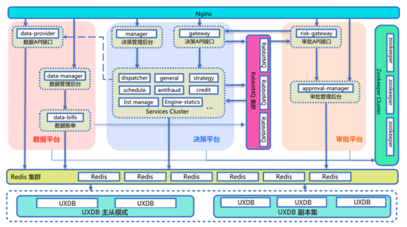 决策引擎采用微服务方式,保障功能的扩展灵活度。系统主要包括数据平台、决策平台、审批平台。数据库采用 UXDB 主从模式和副本集。