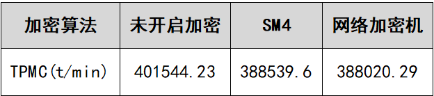 从表中数据可以看出,开启加密后,全内存操作情况下,无论是软件加密的SM4,还是网络加密机,在TPCC的基准测试中性能损耗仅在3%-5%左右。