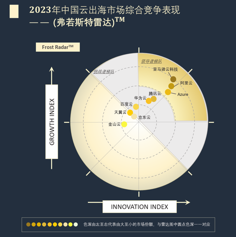 《2023年中国云出海市场报告》在评估云服务商的全球化竞争力时,采用由“创新指数”(横坐标)和“增长指数”(纵坐标)构成的 Frost Radar (弗若斯特雷达) 评价体系。其中,“创新指数”衡量指标涵盖云服务商在基础设施创新、服务质量及丰富度、解决方案智慧化及安全性等维度;“增长指数”衡量指标涵盖云服务商的基础服务体系及服务落地、全球合规及生态、市场覆盖面等维度。在“增长指数”和“创新指数”两大维度,亚马逊云科技取得了双项排名第一。