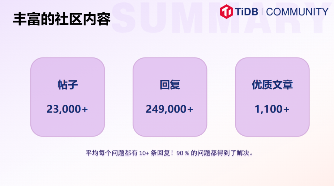 2023 年,TiDB 社区依旧是充满活跃与盼望、学习氛围很好的存在。TiDBer 之间互相交流学习和使用 TiDB 的心得和经验,共同探讨着各自面对的挑战和 TiDB 的最新进展。