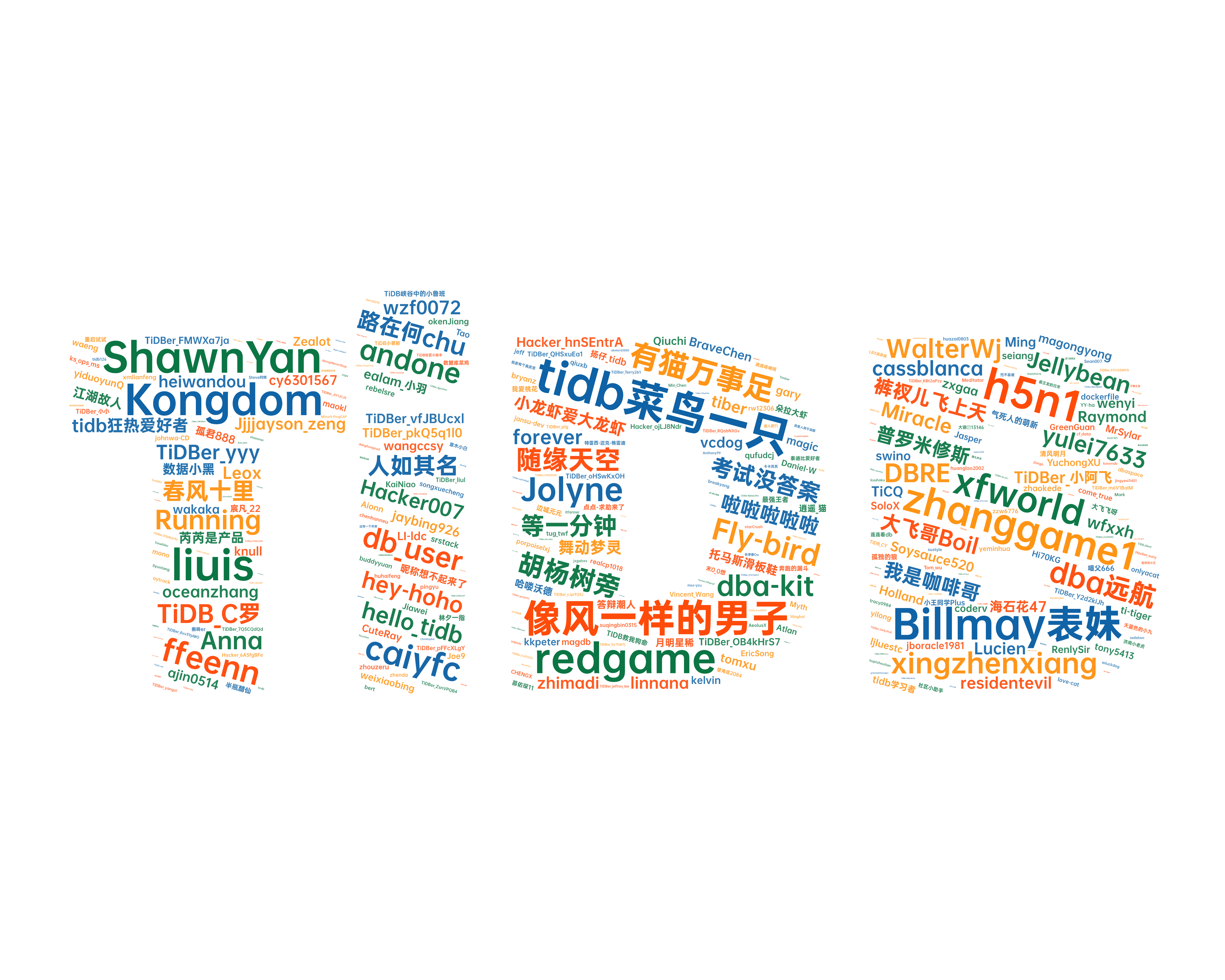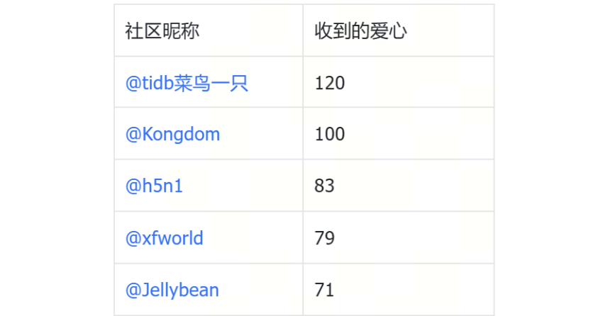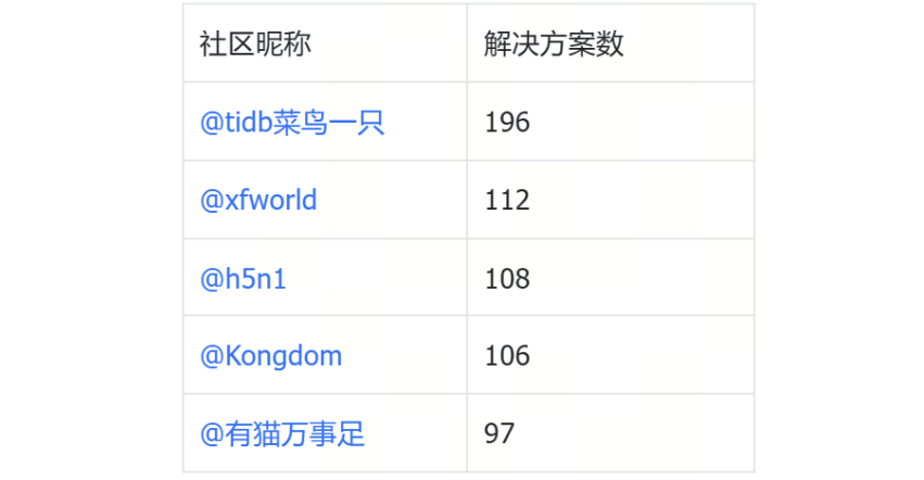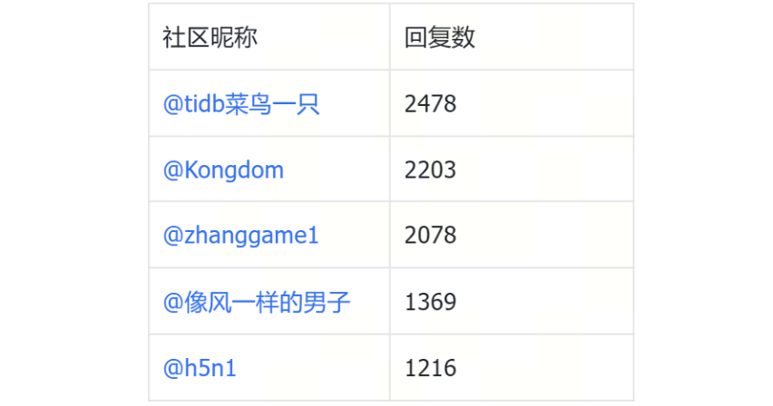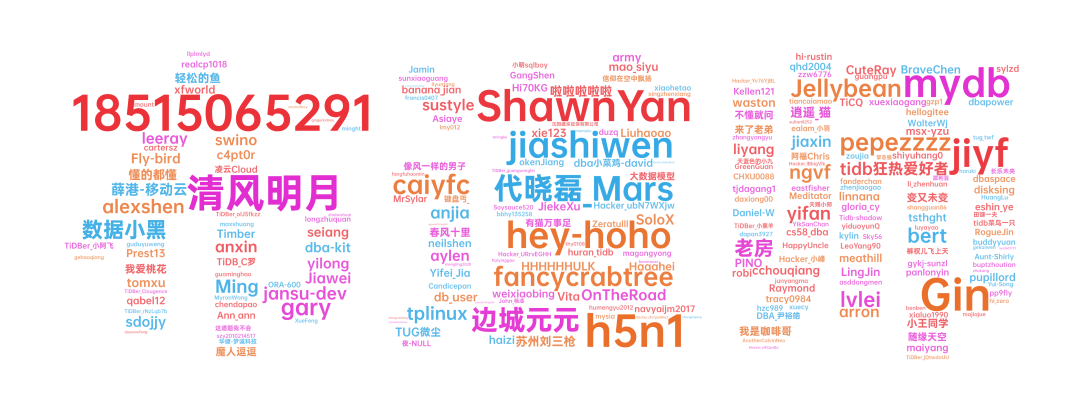 感谢:@清风明月 @tidb 狂热爱好者 @Jellybean @ShawnYan @pepezzzz @weixiaobing @jiashiwen@我是咖啡哥 @gary @Fly-bird @caiyfc @有猫万事足 @像风一样的男子 @okenJiang @sustyle @hey-hoho@TiDBer_ 小阿飞 @HappyUncle @longzhuquan @dba-kit @Raymond @shiyuhang0 @Ming @Liuhaoao @cchouqiang @BraveChen @啦啦啦啦啦 @db_user @大数据模型 @Gin @GangShen @随缘天空 @WalterWj @tidb 菜鸟一只 @li_zhenhuan @bert @humengyu2012 @gykj-sunzl @xingzhenxiang @沈阳盛京征信有限公司 @Soysauce520 @buddyyuan @裤衩儿飞上天 @LingJin @数据小黑 @realcp1018 @h5n1 @seiang @jansu-dev @苏州刘三枪 @TiDBer_ 小黑羊 @Daniel-W @Yifei_Jia @春风十里 @魔人逗逗 @swino @hellogitee @Prest13 @msx-yzu @panlonyin @Timber @linnana @tomxu @TiDB_C 罗 @qabel12 @sdojjy @asddongmen @arron @anxin @我爱桃花@TiDBer_jQtwdoUU @SoloX @waston @tjdagang1 @fanderchan @Tidb-shadow @qhd2004 @jiaxin @meathill @CuteRay