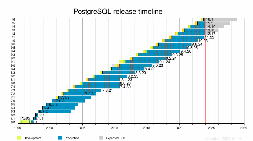 PostgreSQL 内核主干每年发布一个新的大版本,每个大版本都会引入一些新功能特性。PostgreSQL 10 是一个分水岭版本 —— 之前的大版本号都是9.x,在10之后才变为每年调大 Major 版本号。
