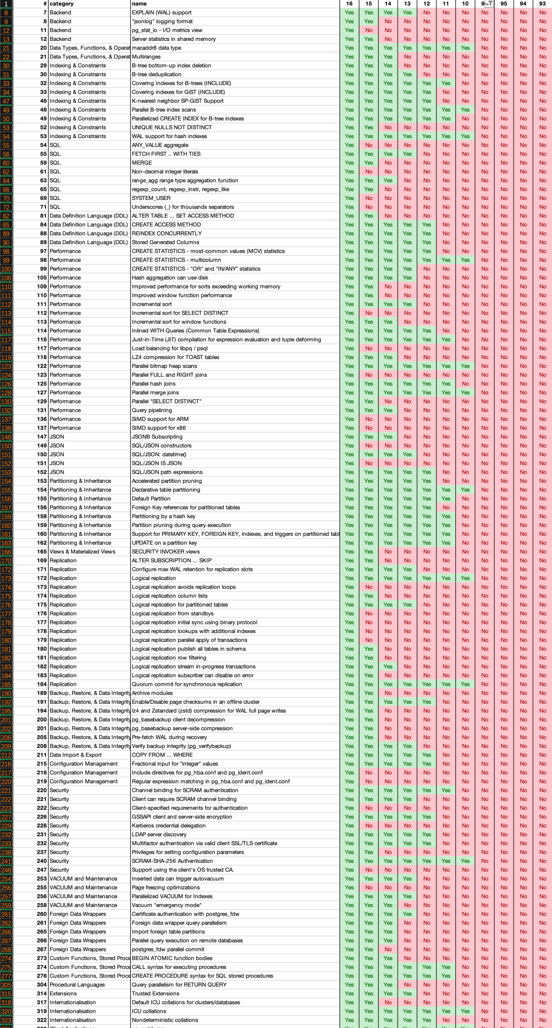 如果我们查阅 PostgreSQL 官网的特性矩阵,目前总共列出了 377 个功能特性。其中,新出现在 PostgreSQL 10 及以后版本的特性共有 107 个,占了总数的三成。如果从10年前的 9.4 开始算起,有四成的特性是在最近十年间新引入的。