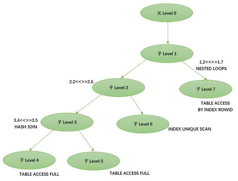 7 1 TABLE ACCESS BY INDEX ROWID DEPT (Cost=1) -->pid=1,level 7可以看到,Level 1 包含 Level 2 和 Level 7 这样的 2 个分支 Level,由于 Level 7 优先级高于 Level 2(pid7 > pid2),因此,Level 7 优先执行。