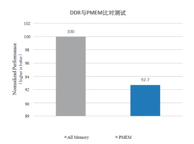 图 4-4 所示为 DDR 与 PMEM 性能测试对比,在实现室环境下相同硬件测试平台上,采用持久内存的平台整体性能可以达到全内存平台的 92.7%。