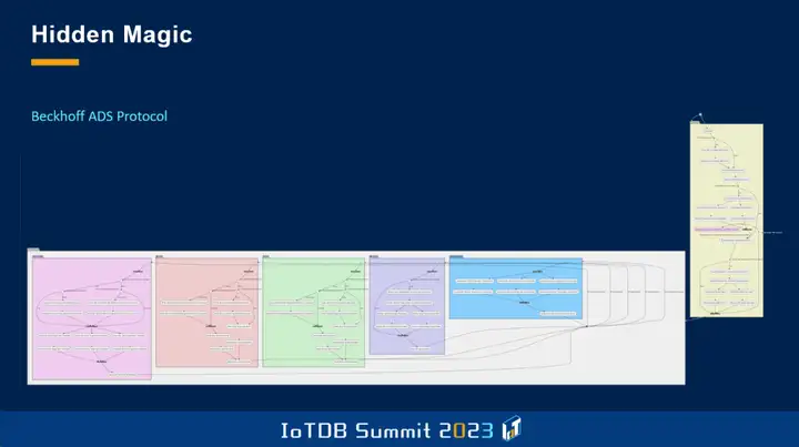 为了让大家对工业协议的复杂性有一点了解,这里有一个简单的示例,展示了 Beckhoff ADS 协议的连接状态图。在黄色部分的一侧,表示连接建立的过程。你可以看到有许多状态和条件,决定了控制流的不同走向。这里面还有,比如红色代表读取,橙色代表写入,还有用于浏览、订阅等等的流程,可以看到这相当复杂。过去,通常你需要在程序中自己处理这种复杂的流程,但 PLC4X 完全替你处理了这一切。你只需要告诉它,比如“我想读取这个变量”,PLC4X 就会处理所有这个请求需要的复杂路径。