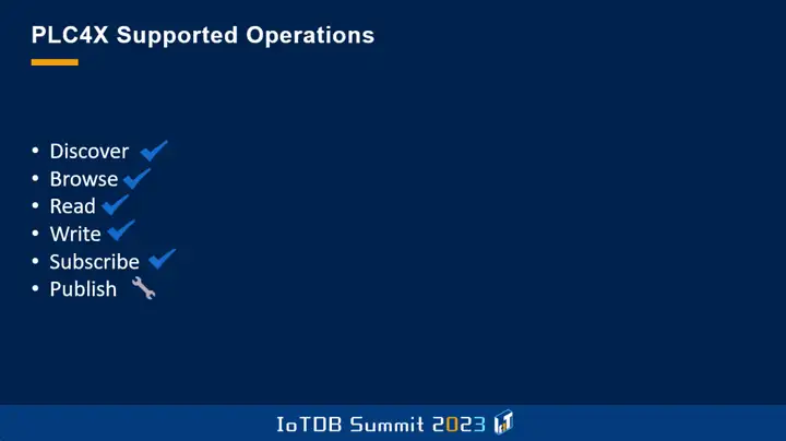 PLC4X 支持哪些操作呢?首先,它支持发现功能。如果某些 PLC 或工业硬件、自动化硬件支持发现功能,我们的 Discover 模块肯定会捕捉到。一旦找到并连接到设备,你可能会想了解该设备提供了哪些数据,这就是 Browse API 的作用。现在你了解了设备上有哪些数据,可能会想要读取它,这可以通过 Read API 完成,或者你可能想用 Write API 进行写入。一些协议甚至支持订阅功能,因此你还可以订阅变量的变化情况,然后定期地或在变量变化时看到。